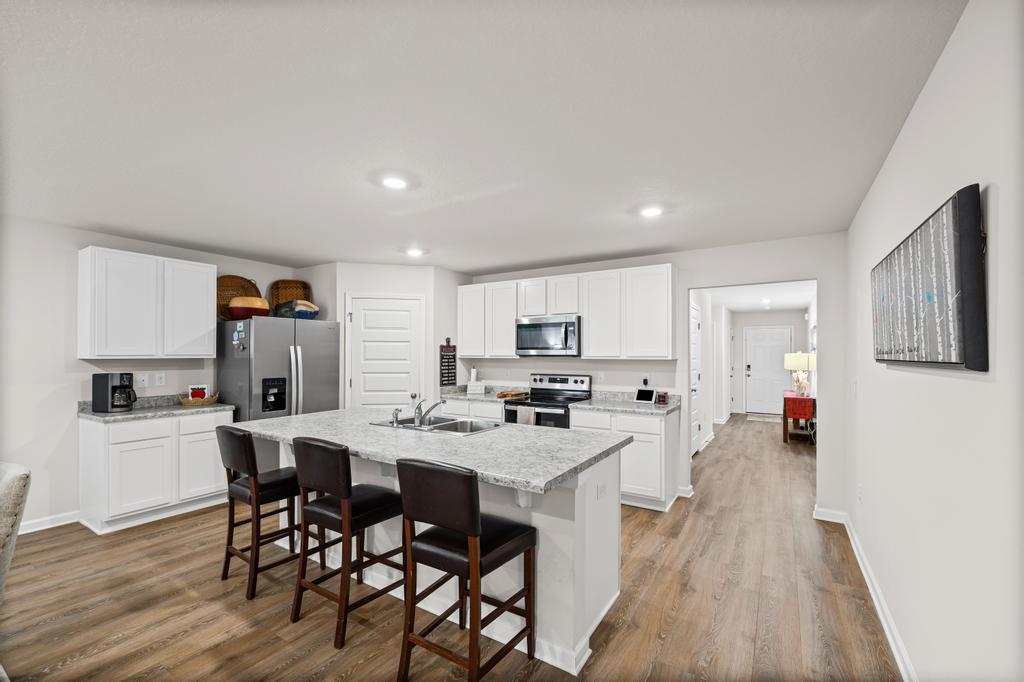 2022-built residence offers a fresh, modern layout designed for comfort and daily convenience. The main living space blends the kitchen, dining area, and family room into a clean, open environment that works beautifully for both quiet evenings and small gatherings. The kitchen features a central island, a practical workspace, modern appliance package, and convenient pantry storage.